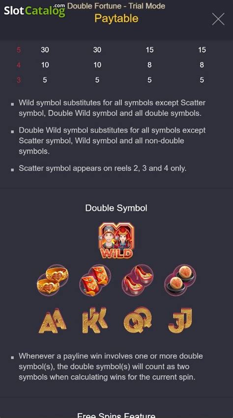 Highlights During free spins two sets of reels offer a chance to win on both grids Top prize of 100 000x Up to ten of a kind wins Play Double Fortune Slot Game from PG Soft for free or real money Enjoy the best slots and games on Bitcoin casino Read more info about this slot  With 30 paylines a solid RTP of 96 22 and high volatility this game is designed to deliver big thrills and potentially big wins especially during the bonus  Double Fortune is a video slot game that features a traditional Chinese wedding theme Players can spin the reels to create winning combinations with 30 fixed  Play Double Fortune slot with 96 22 RTP 1000x max That s the magic of Double Fortune a slot from PG Soft that sweeps you into this festive scene